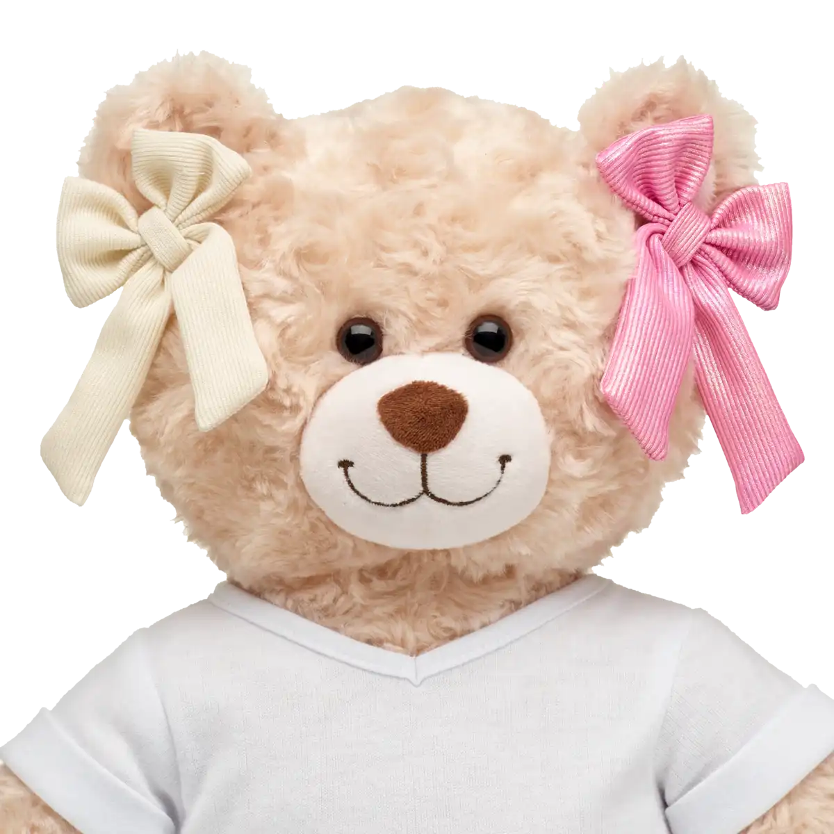 Füge einen Hauch von Süße mit unserem 2er-Pack Schleifen Weiß/Rosa hinzu – das perfekte Zubehör für jedes Kuscheltier