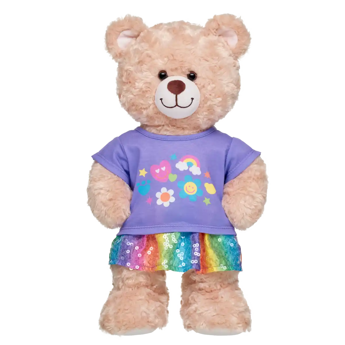 Rainbow Icons sæt er et farverigt tøjsæt med t-shirt og nederdel, skabt til at tilføje ekstra karakter og leg til din Build-A-Bear bamse. Sættet er inspireret af regnbuens glade farver og ikoniske symboler, der gør det nemt at style din bamse med et udtryk, der passer til både hverdag og fest.