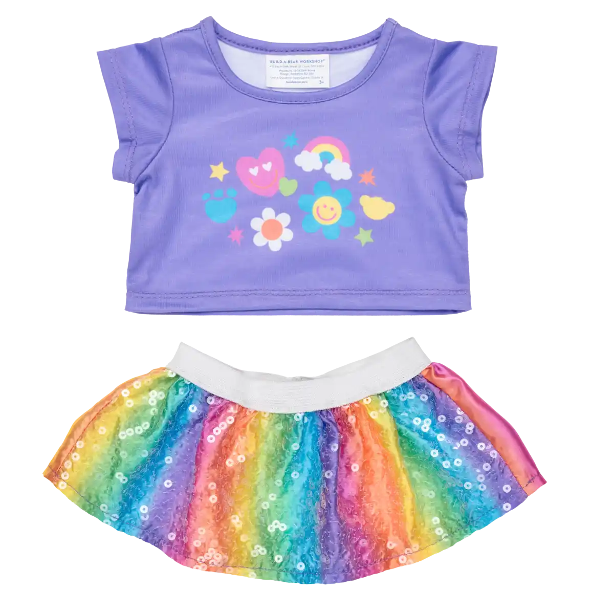 Rainbow Icons sæt er et farverigt tøjsæt med t-shirt og nederdel til Build-A-Bear bamser med regnbuetema, designet til at give bamseoutfittet ekstra personlighed og stil.